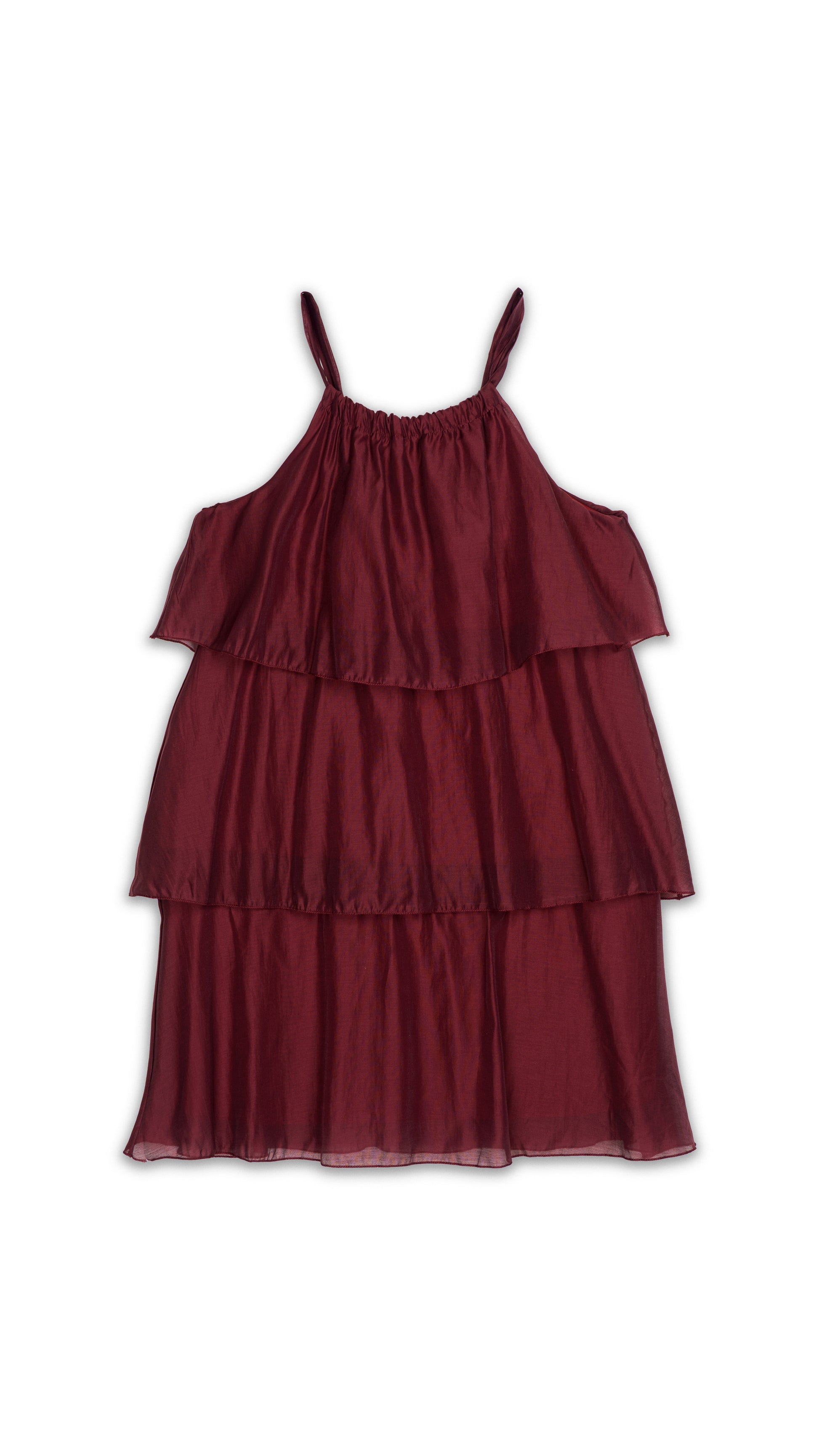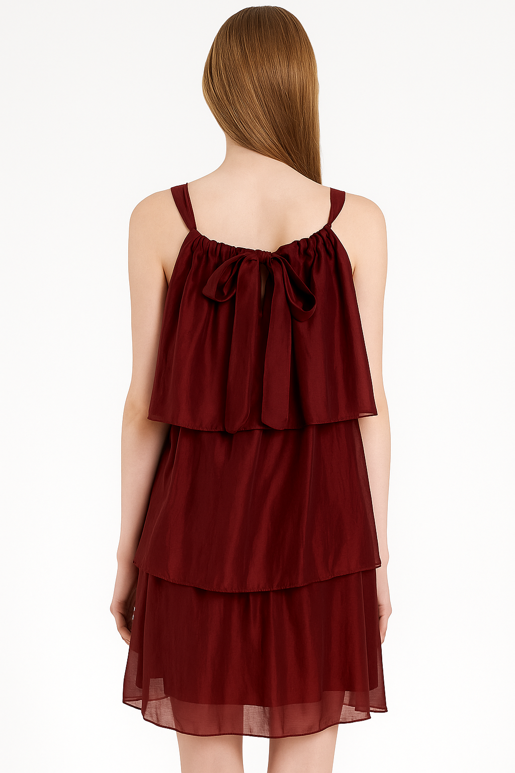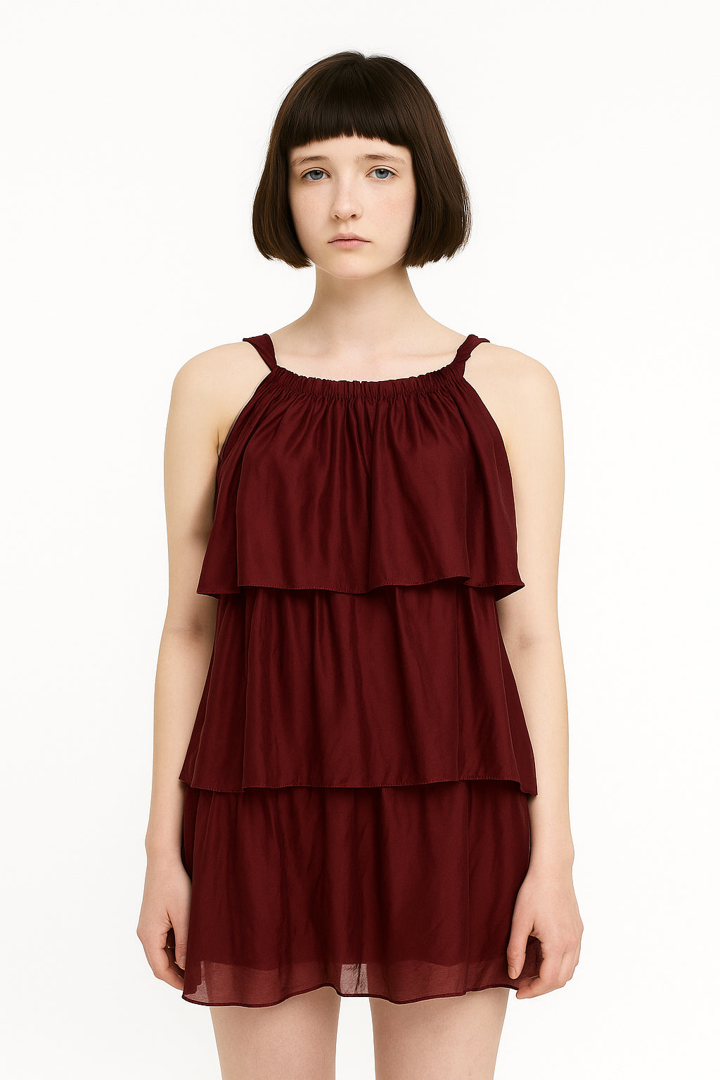 Abito con balze in tinta bordeaux. Presenta una scollatura arricciata regolabile con le bretelle ed è rivestito internamente per garantire una coprenza migliore.