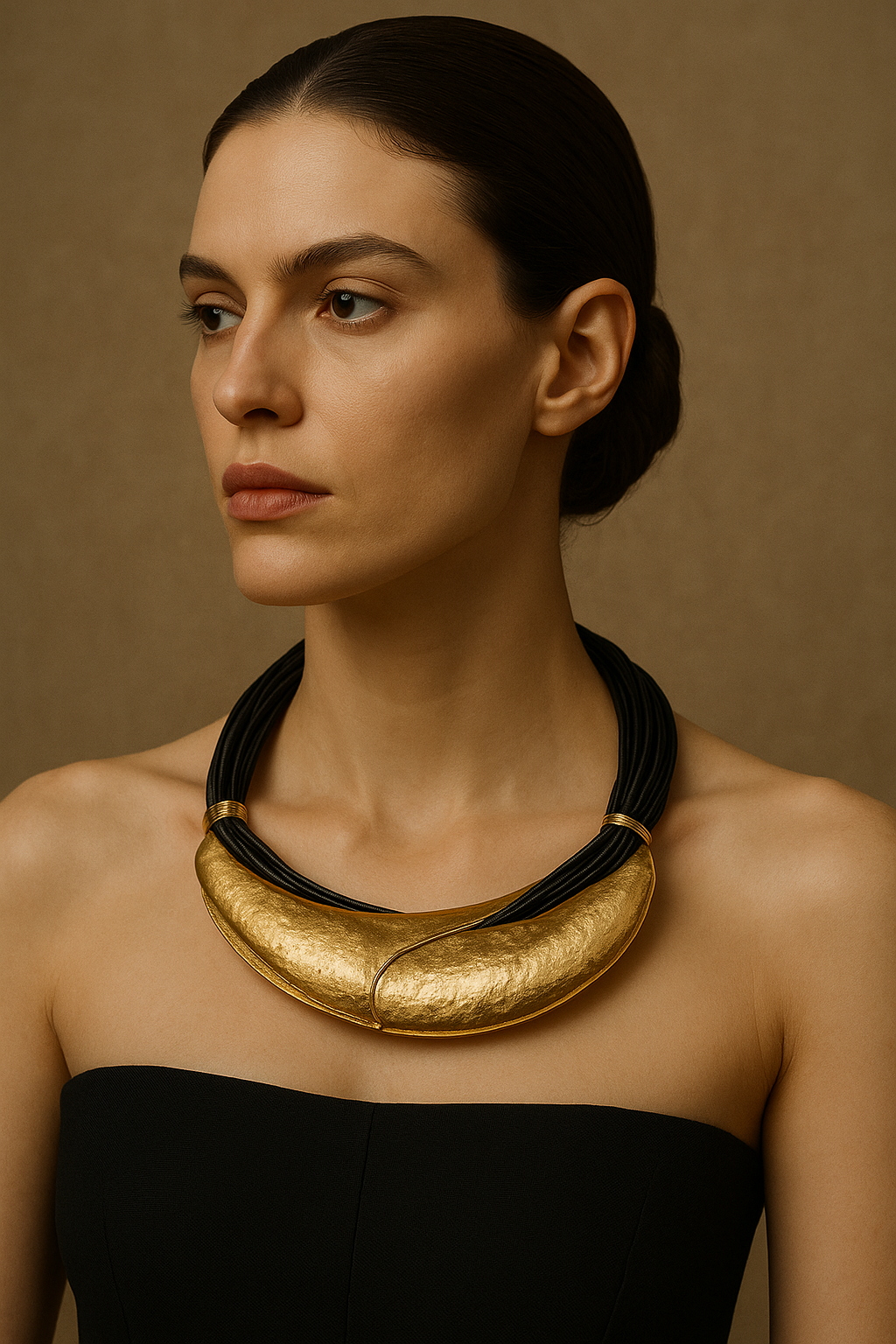 Il gioiello di design è in acciaio inossidabile e ottone con un effetto martellato e luminoso.