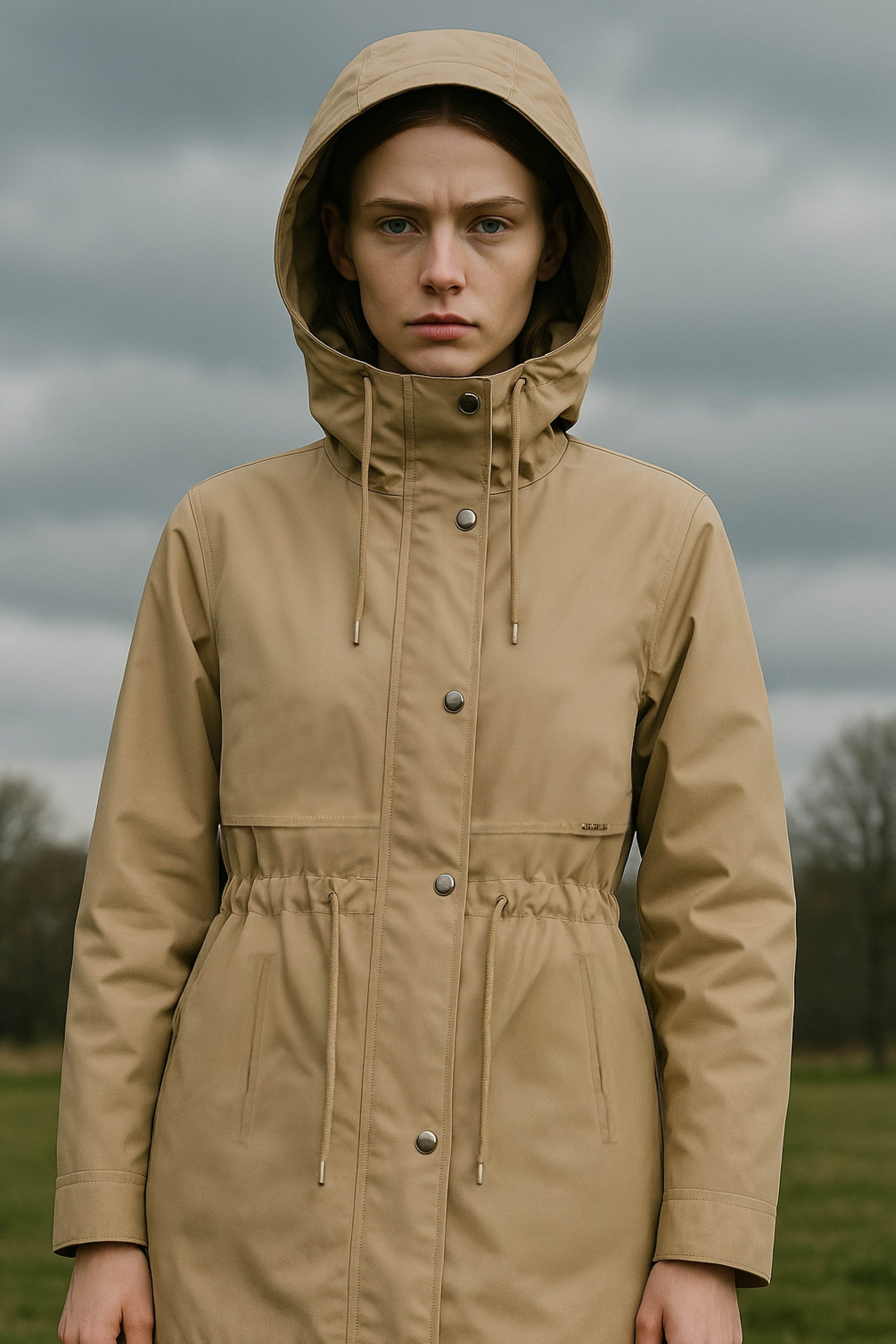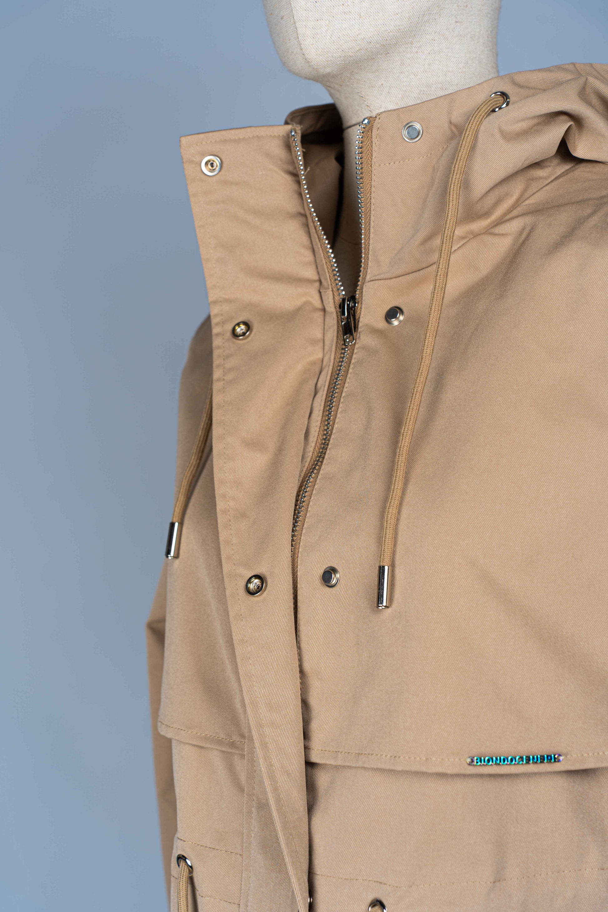 Parka Camel foderato dalla vestibilità comoda e regolabile con i laccetti della coulisse in vita.