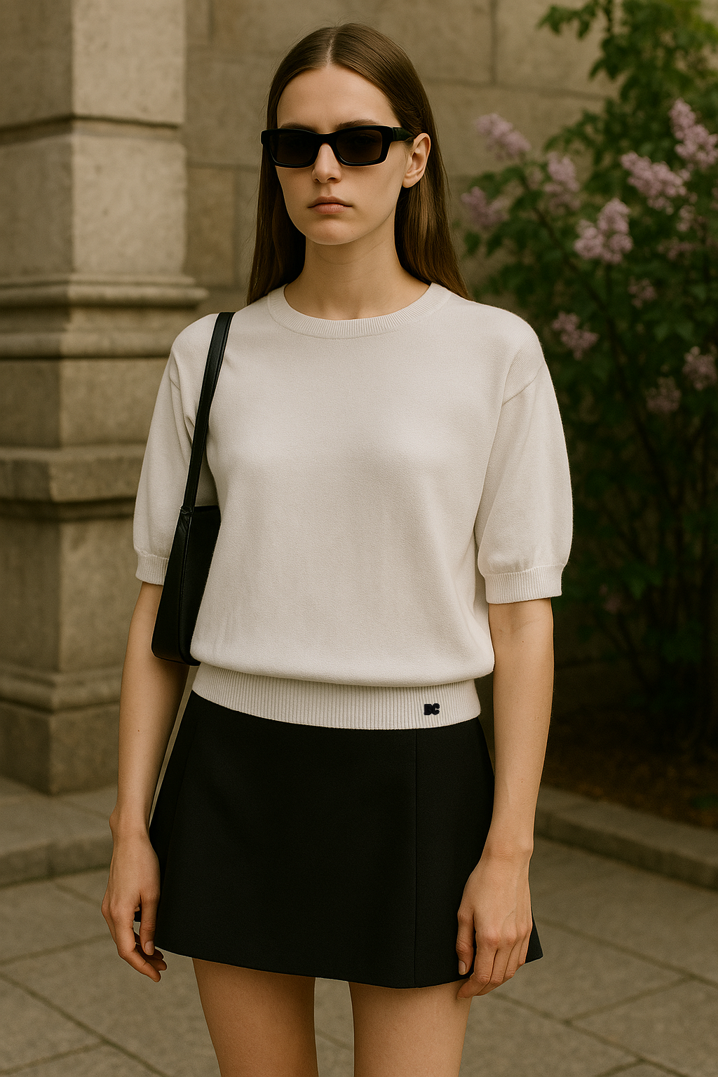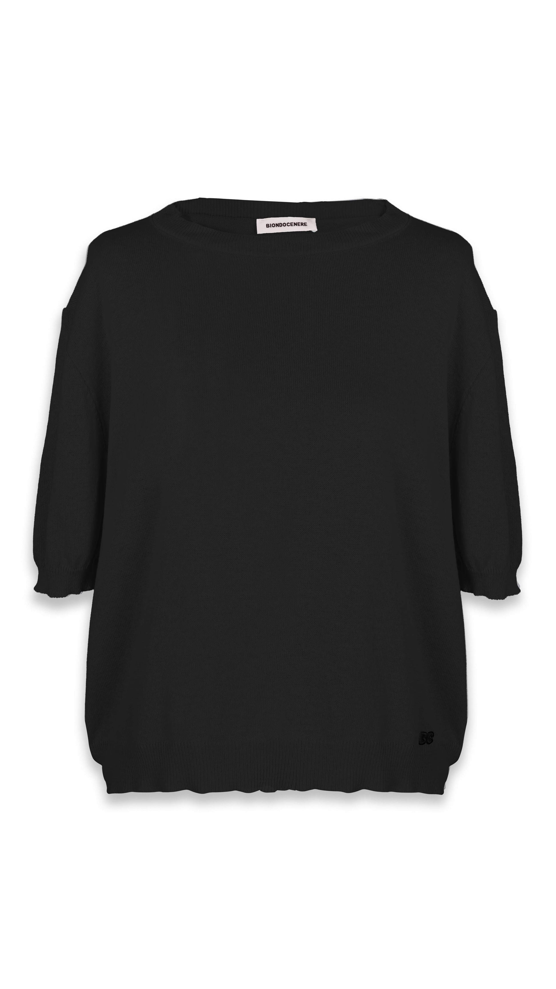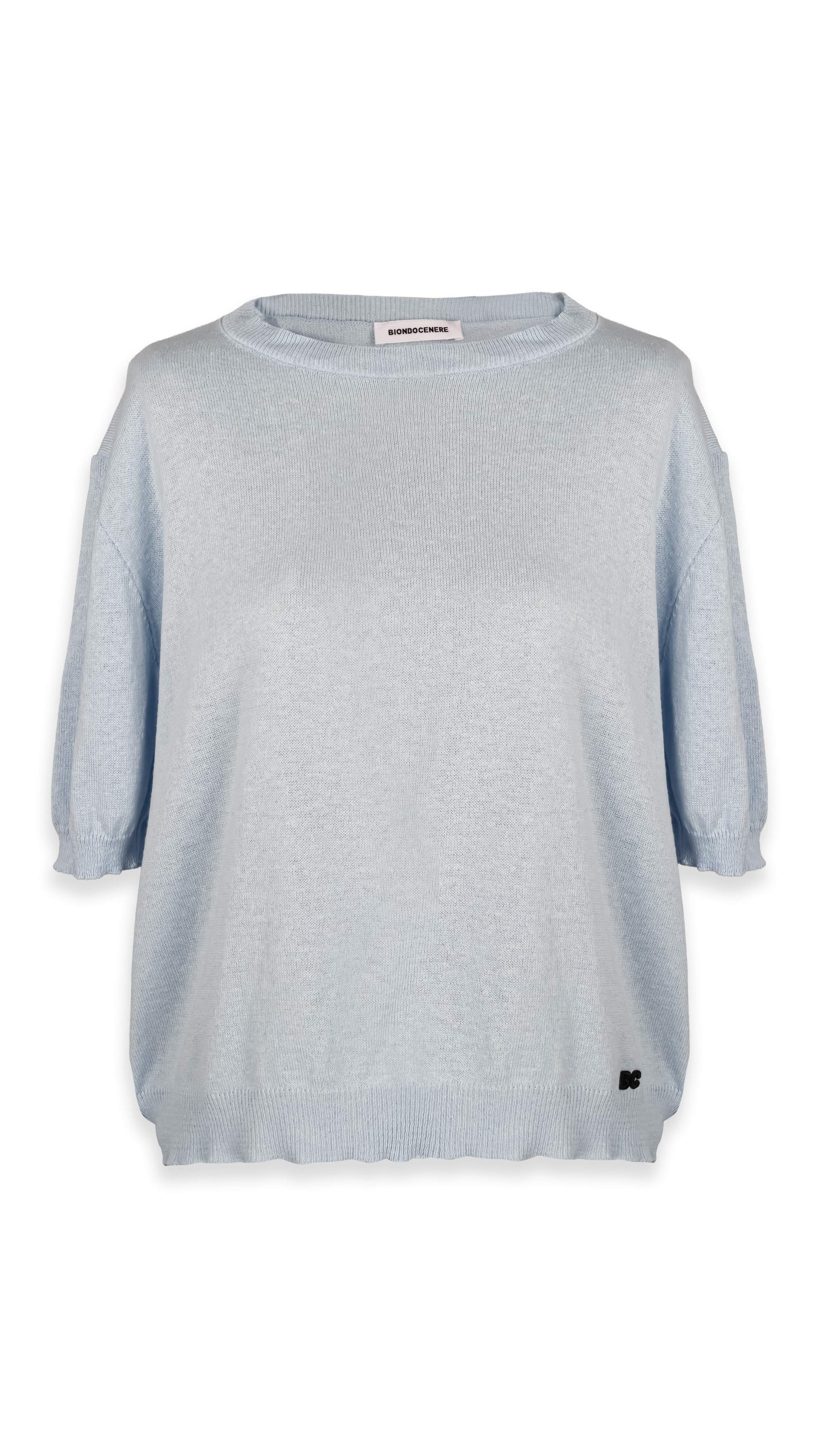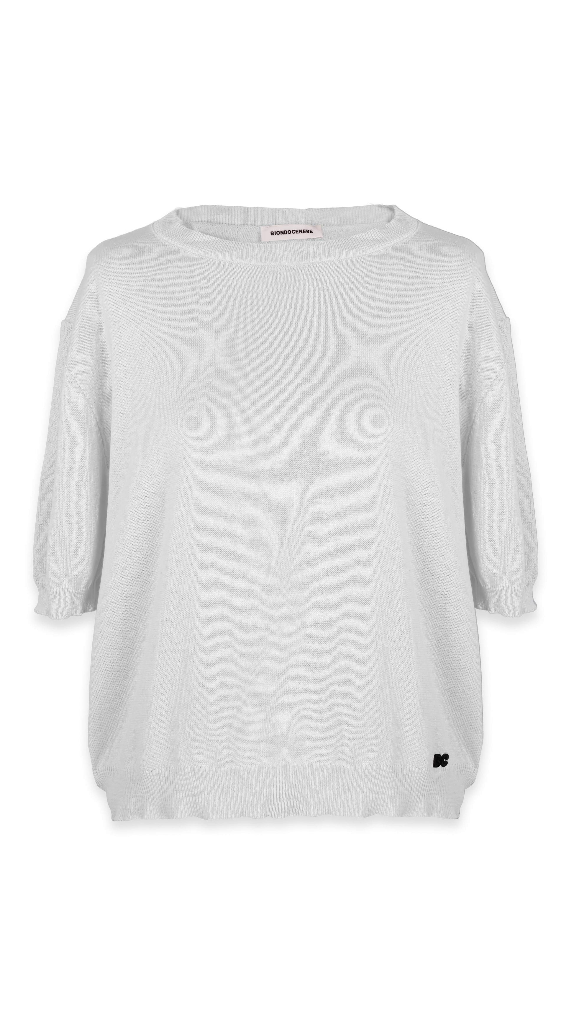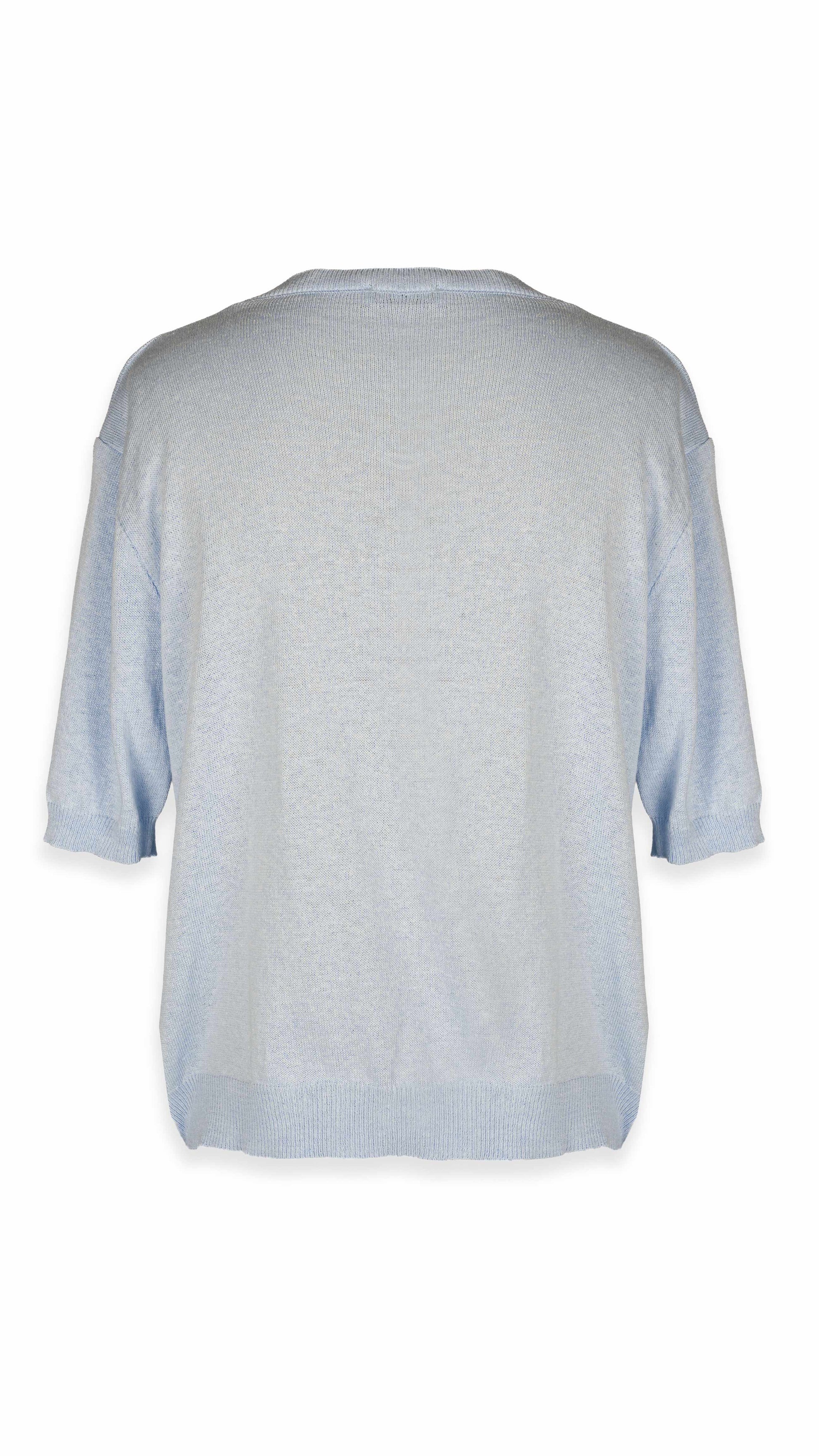 Con una texture in filo fresca e confortevole, il modello cade a scatola con maniche a tre quarti. Bordini rifiniti a costine sottili adornano il pull conferendo struttura e una forma più morbida.