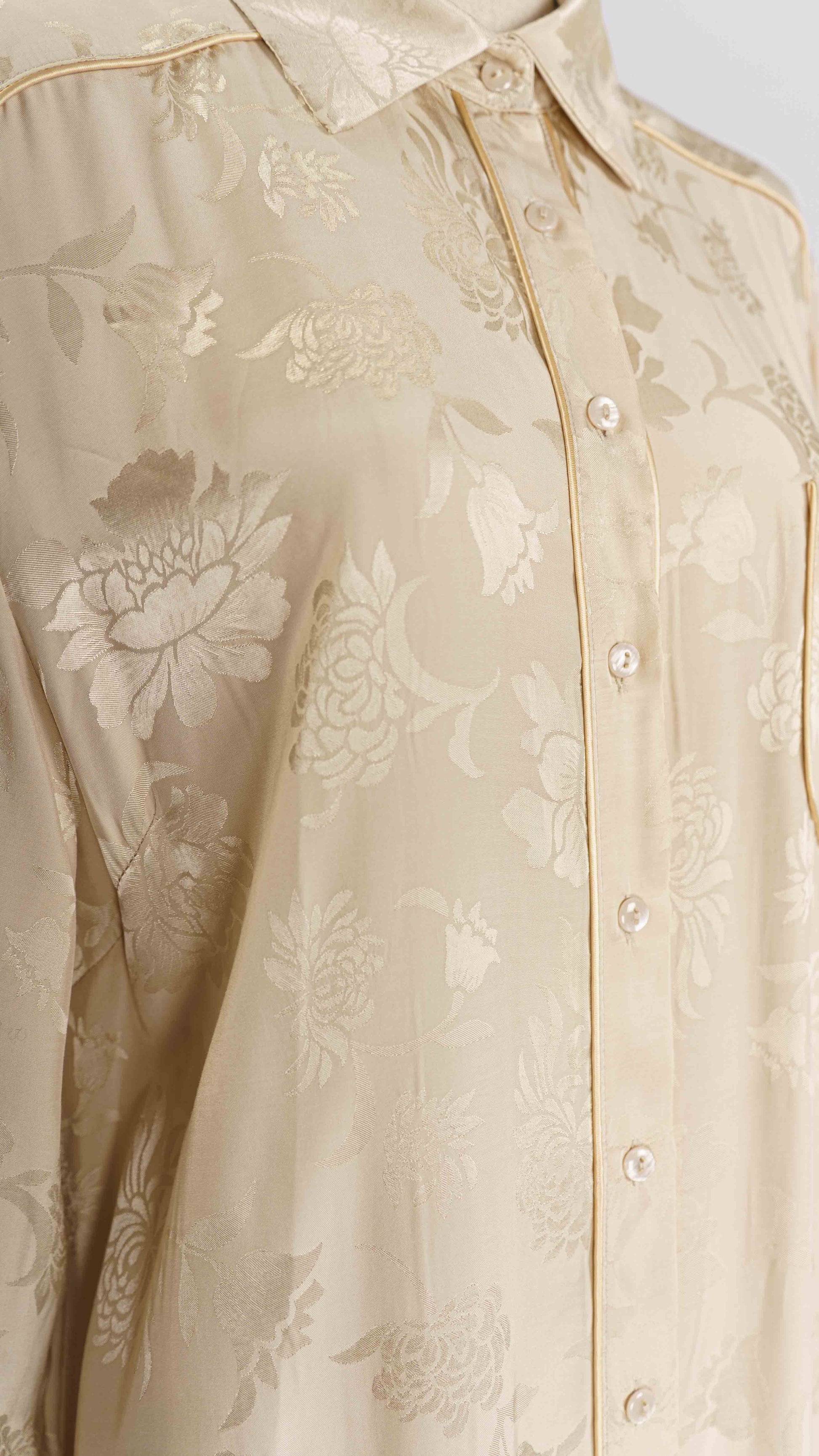 Fantasia floreale effetto jacquard con filatura dorata. Taglio completamente sartoriale MADE IN ITALY. Composizione 60% Viscosa 40% Rayon
