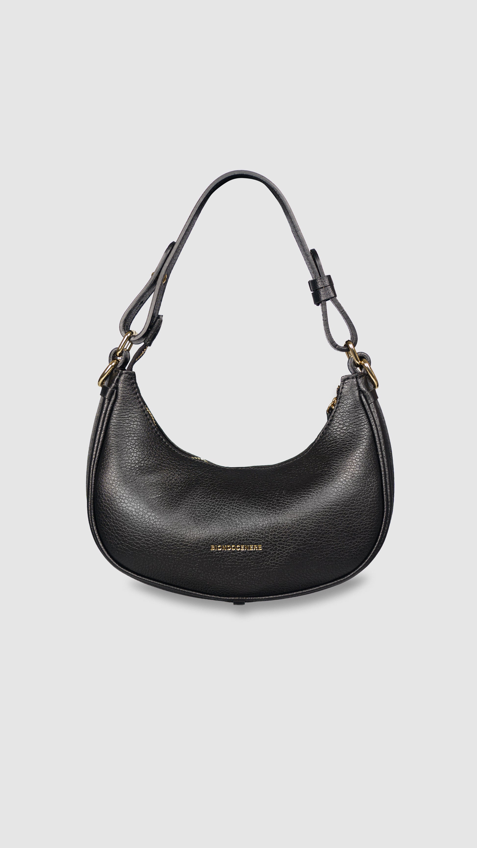 Manico a cinturino regolabile, ganci per tracolla sottile inclusa e tasca interna con cerniera.