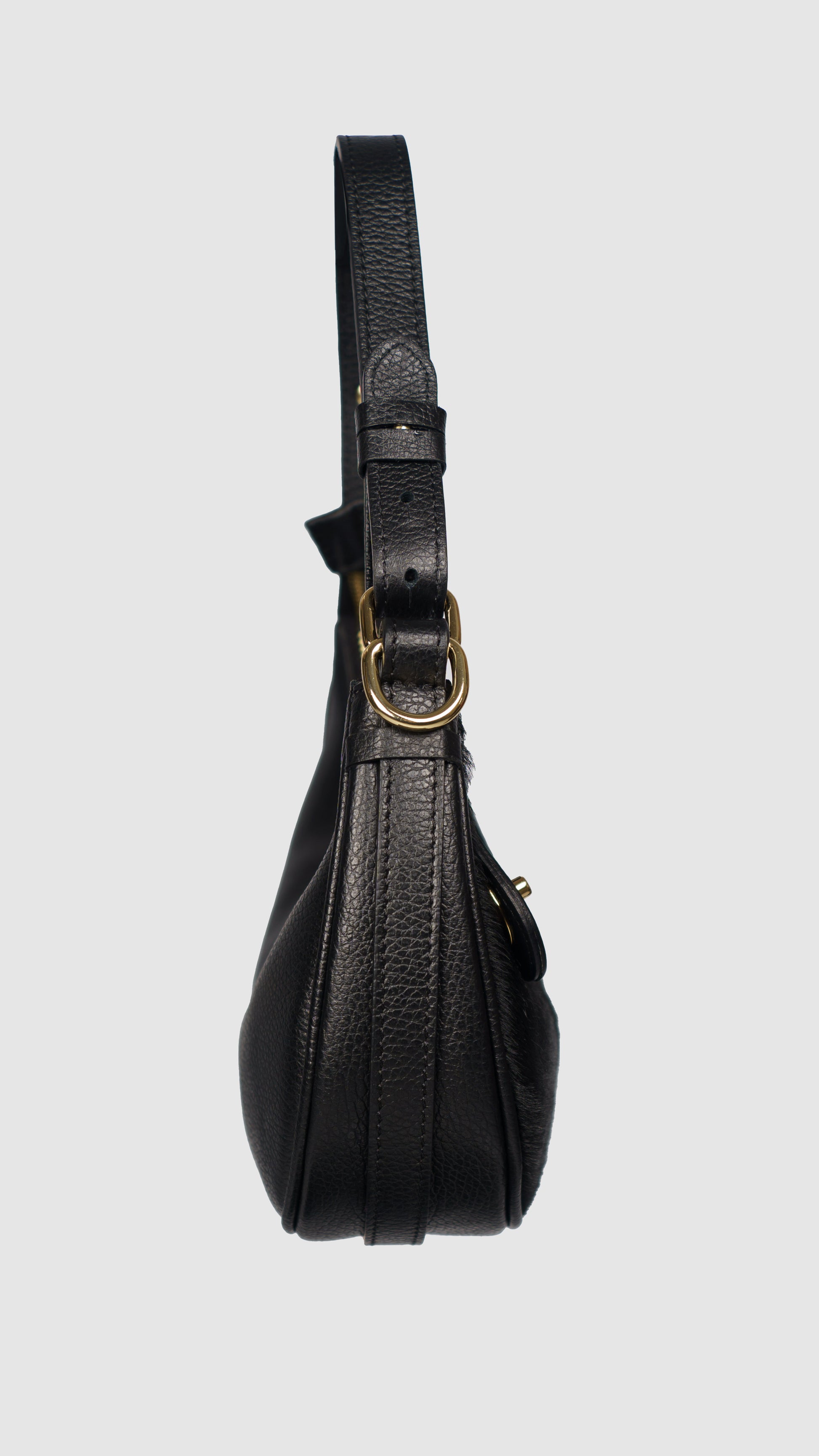 Borsa colore nero modello baguette e rifinitura cavallino nella parte frontale.