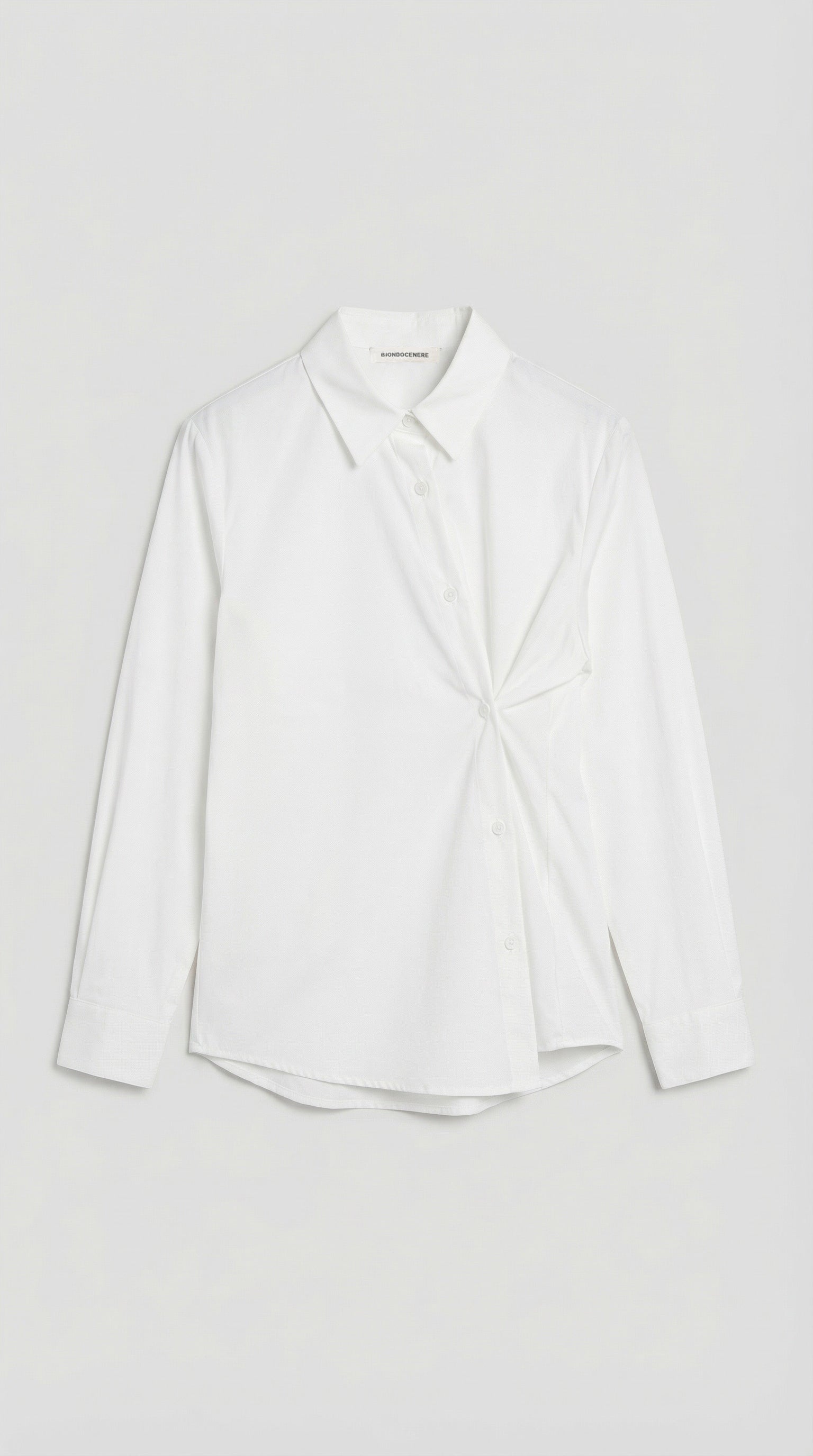 Design: Presenta una chiusura frontale originale con bottoni disposti verticalmente come le classiche camicia ma un unico bottone per la chiusura diagonale, creando un effetto drappeggiato e contemporaneo.