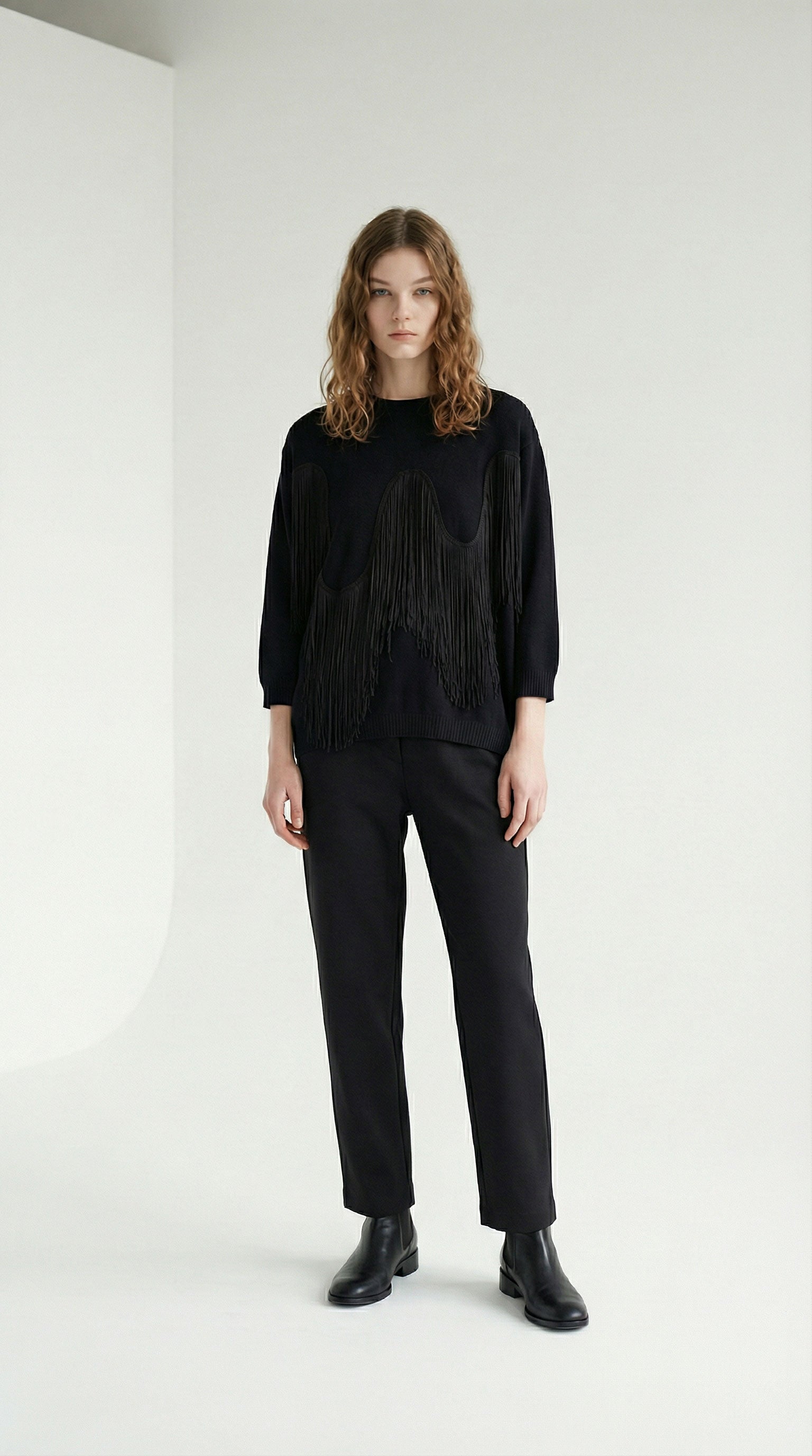 La linea è leggermente ampia sui fianchi e si stringe delicatamente verso la caviglia, creando una silhouette moderna e femminile.